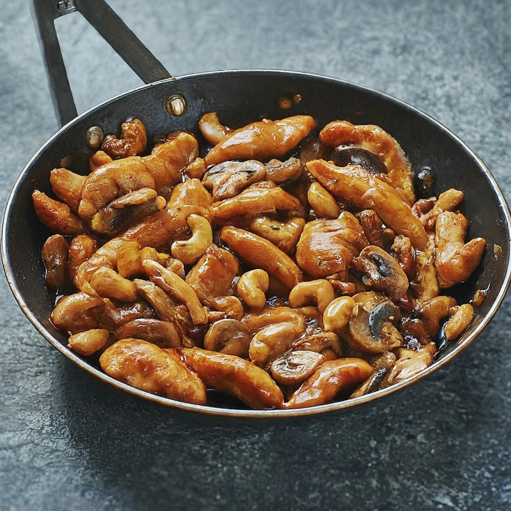 - Heat half the oil in a wok or frying pan over low heat and brown cashews evenly. Remove from pan.