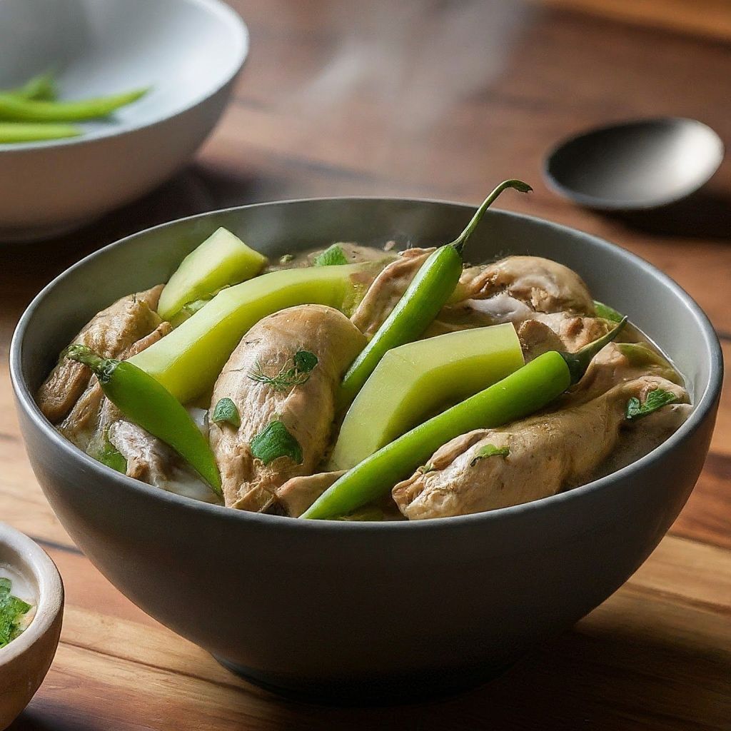 For green papaya, the first choice of substitute is sayote. If unavailable try very unripe melon, the honey dew variety. I think the texture and sweetness would be similar although honey dew does not have papaya’s meat tenderising properties and the chicken has to be cooked longer. If fresh chilli leaves are unavailable, try spinach. Arugula might also do.
