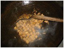 Heat the oil in a large wok, add the tofu cubes and stir-fry for about 2 minutes, until beginning to brown on all sides. Remove with a slotted spoon and keep warm.