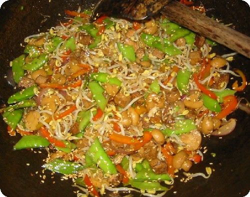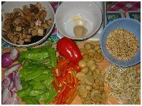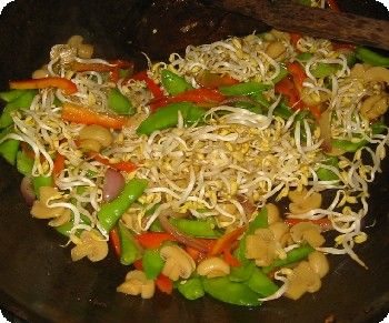 Reheat the oil, adding a little more if necessary. Add the onion and stir-fry for 2 minutes. Add the mangetouts and red pepper (capsicum) and stir-fry for 2 minutes. Add the mushrooms, beanshoots and reserved marinade and stir-fry for 2 minutes, until heated through.