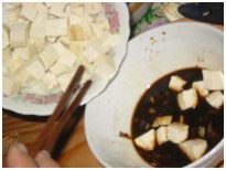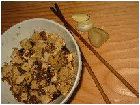 Mix the soy sauce, sherry, chopped ginger and garlic together in a bowl. Cut the tofu into cubes and add to the bowl, stirring to coat completely. Leave to marinate for 1 hour, then drain, reserving the marinade.