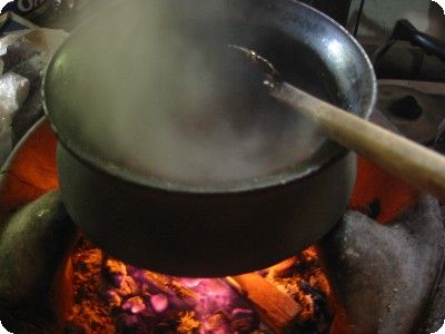 Put in the carrots, simmer for two minutes, the button mushrooms, the courgettes and then a few tablespoons of water. After simmering for around 5 minutes, drop the rest of the basil and around four tablespoons of cheese. Simmer for another ten minutes, pour the wine and simmer for around 5 minutes then turn down heat. I just let the pot simmer with embers.