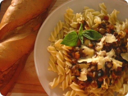 Serve over fusilli (spirals) pasta and drizzle with cheese.