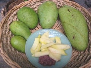 The carabao mango is also eaten green with bagoong (baguc or salted shrimp fry paste) but the pico (or piko) is more sour, usually preferred by conceiving women, to partly relieve nausea. The pico mango is also ripened for dessert and is almost or can be as sweet as the carabao variety.