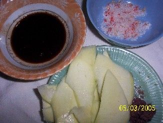 The Indian mango is a small and plump variant which is best eaten unripe. The ripe fruits are not only a bit bland but have an aftertaste which is supposedly like medicine. The largest mango in the picture at the end of the entry and the ones in the basket above, are of the Java variety, which is around a foot long when fully grown, is good for sour snacking and pickling but it’s too bland-sour to be served ripe. In the picture below are slices of Java mango. Side-by-side with my usual bagoong I tried the Hawaiian dip (sugar, salt, a bit of soy sauce and pepper), according to Lance, and the Thai dip (salt, sugar and some ground chillies), courtesy of Thess, who is not Thai but a Filipina in the Netherlands. Lance’s dip is what he said it to be, all the different flavours in one bite. Very flavourful. The Thai dip is quite reminiscent of the spicy tamarind preserves one buys in Bangkok. Sweet, sour, salty and spicy. Should I dare say unmistakably Asian?