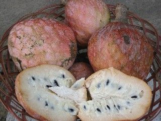 “Native of tropical America and widely cultivated in the Philippines. It is also known locally as ‘salikaya’ and ‘sarikaya’. The fruit is heart-shaped and reddish or yellow when ripe; pulp is white, sweet, slightly granular toward the skin and contains many large, dark-brown seeds that adhere closely to the pulp.”
