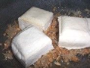 Place the tokwa over the garlic and ginger, cover the pan for around five minutes to steam the cakes. After five minutes, invert the cakes, then sear the sides too. Total steaming time would be around 20 minutes after which the cakes should be taken out and set aside. The ginger and garlic mixture should also be stirred gently now and then.