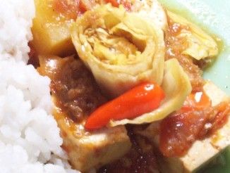 What I’m presenting is a twist on an old family favourite, my grandfather’s original spicy chicken recipe which he called Lutong Bombay (Hi Nupur!). In a way, it is also a continuation of my Lolo’s tinkering in the kitchen to come up with original recipes. His grandchild has now improvised on it to come up with something new yet old, different yet similar. It is actually the garlic and ginger base which lends a very distinct flavour to the dish that made me decide to cook it with tokwa (also tau kwa, firm soy bean cake – tofu will do too).