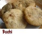 Buchi/bochi is a snack with counterparts in many Asian countries. It is usually sold in igu/bilao or bamboo trays lined with banana leaves by itinerant vendors walking their route around town or in marketplaces. Buchi are made from ground glutinous rice filled with sweetened mung bean paste then fried to the the point it forms a crusty shell but remains soft inside.