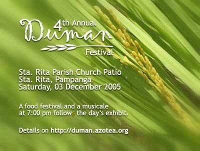 I wrote about last year’s Duman Festival on this blog. This year, I’m making good on my promise to document the process of bringing it from the field to the table. In fact, I was out taking pictures of the lacatan malutu (red-husked glutinous rice plants) yesterday, with two of Arti Sta. Rita’s writing staff comparing common rice leaves and stalks with those of the lacatan. Most of the documentation will be on the Duman Festival website (online but still under construction).