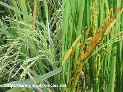 On the right is the rainfed lacatan malutu or red-husked glutinous rice used for duman. I took the palé picture on a cool afternoon sometime in the summer (April-May) while the lacatan was photographed at mid-morning Sunday, 30 October, last week – but both sheafs of grain are approximately of the same age, based on how they bow to the sun.